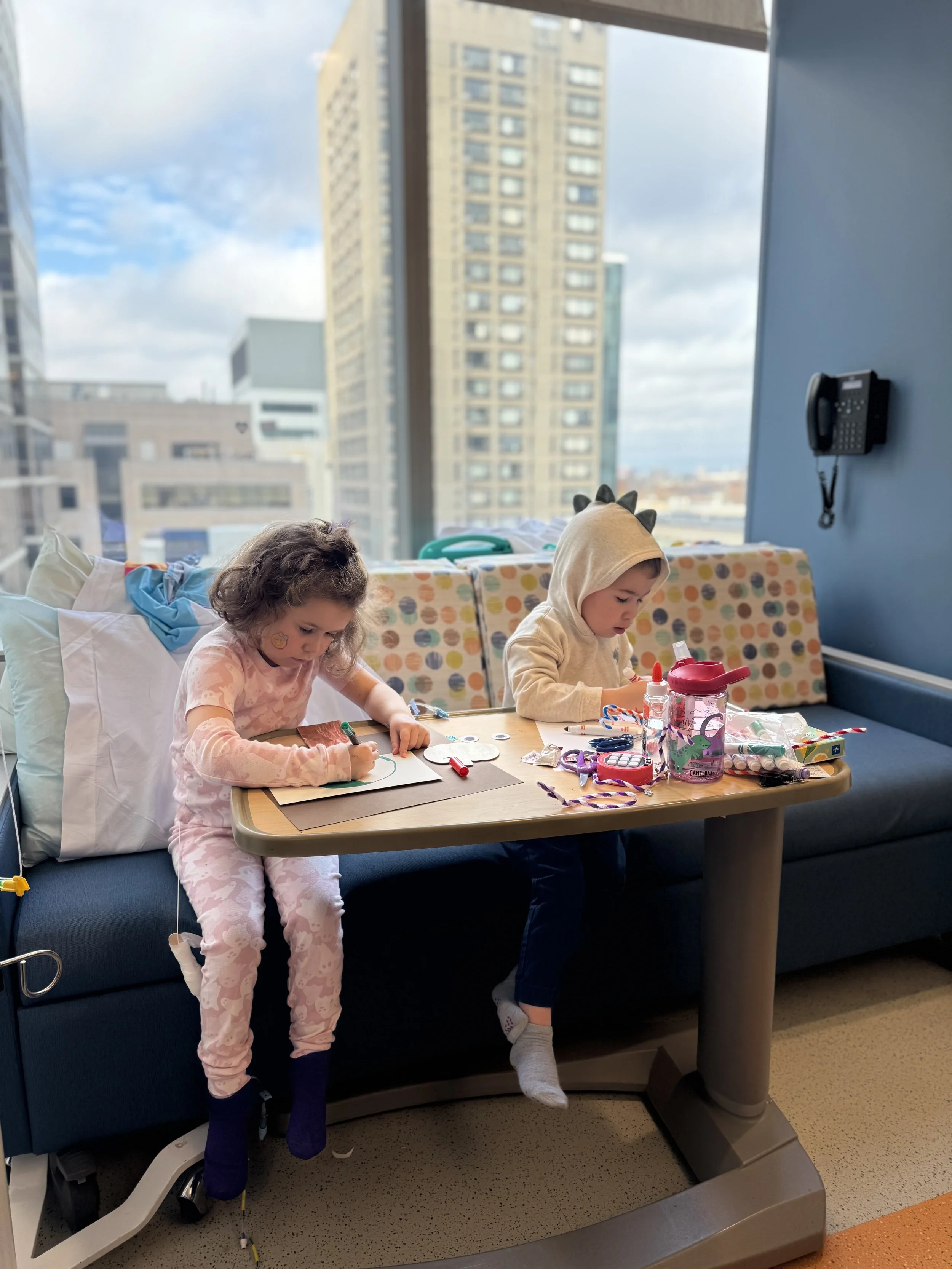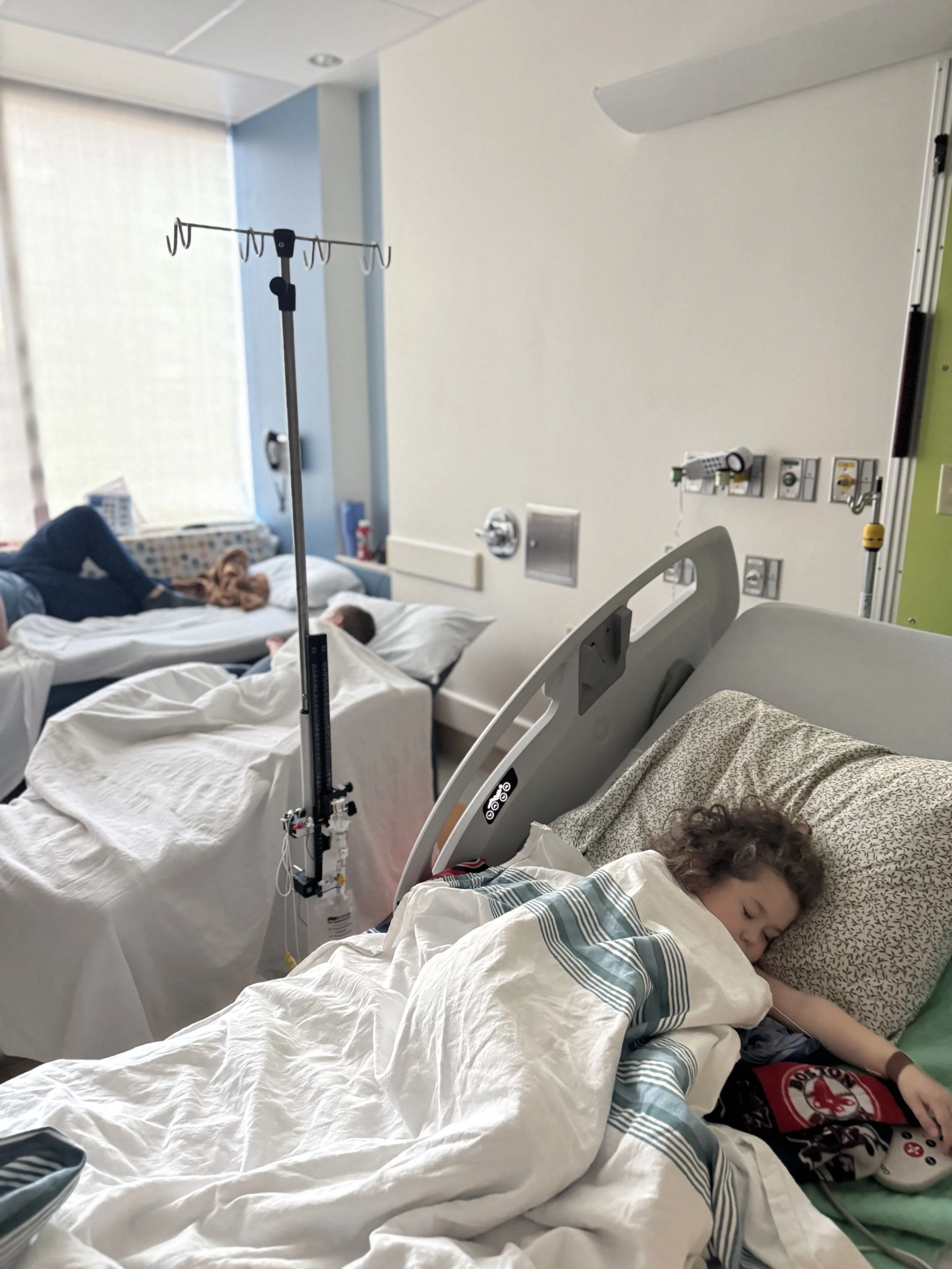 The week of Thanksgiving, only two weeks later, we found ourselves back at Boston Children’s Hospital. On November 27th, Juliette’s cousins arrived, and within a few hours Juliette told us her incision felt “wet.” We rushed her to the hospital, where they determined that the incision was leaking cerebrospinal fluid (CSF) and she underwent an emergency procedure to repair her incision leak. The neurosurgeon was concerned that the CSF would rupture the incision again, and so they recommended a lumbar drain. A rubber tube was placed in her spine so CSF could be drained into a bag every hour, 24 hours / day; this was done to keep the CSF pressure down in order to improve the odds the incision healed properly. Six days later, we were discharged. This inpatient stay was particularly grueling as she was unable to leave the floor and was confined to a wheelchair.